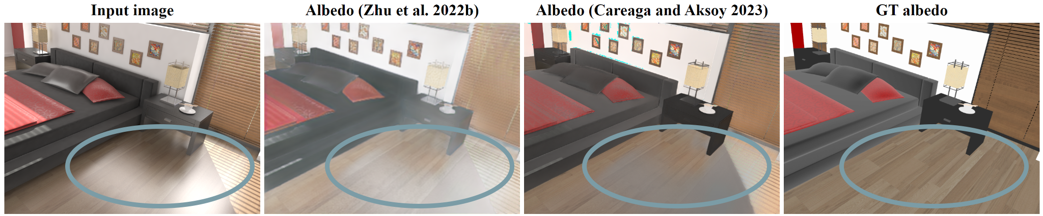 There are strong reflections and shadows on the wooden floor. Previous non-diffusion-model-based methods fail to recover the correct albedo channel.