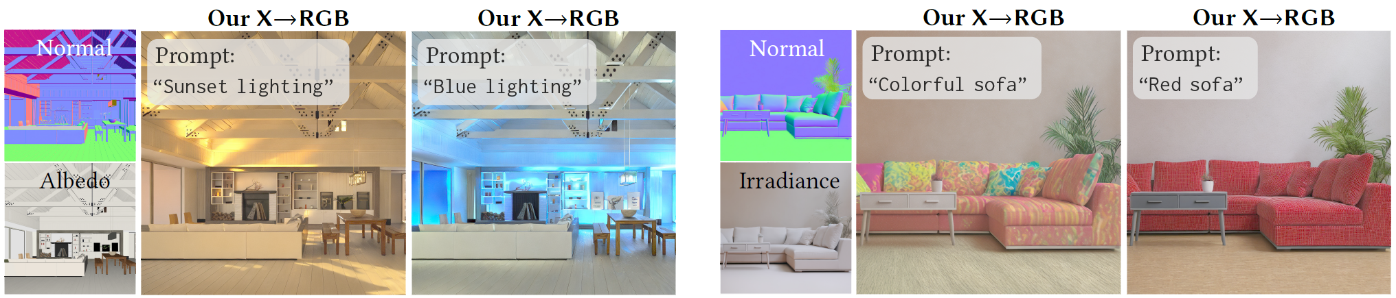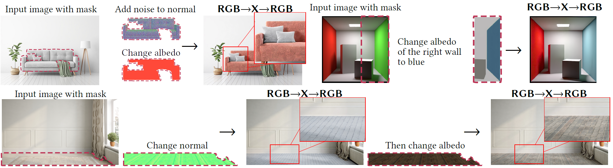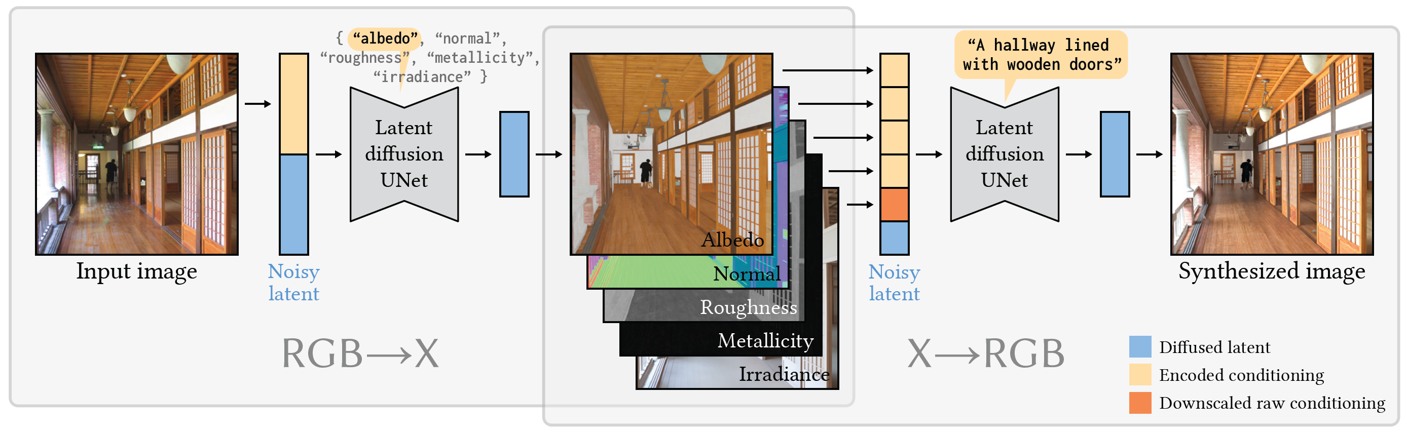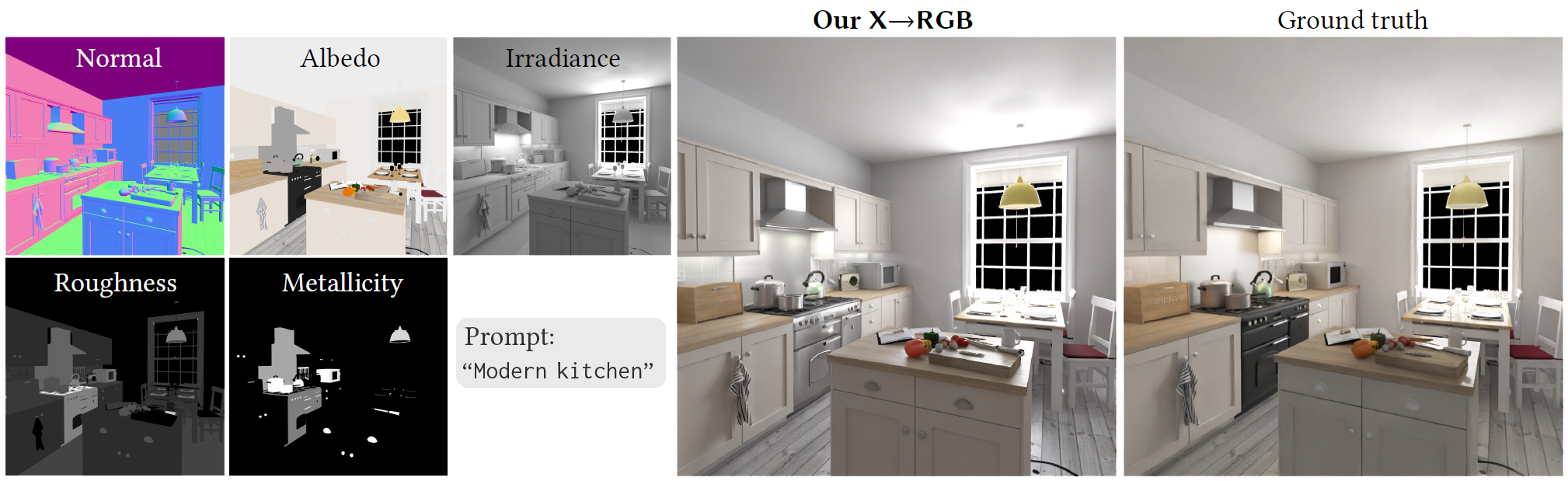 RGB↔X explores the connections between diffusion models, realistic rendering, and intrinsic decomposition. We believe it can bring benefits to a wide range of downstream tasks, including material editing, relighting, and realistic rendering from simple/under-specified scene definitions.